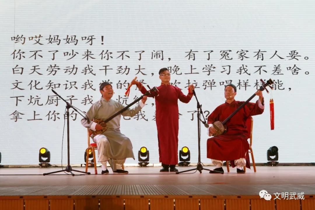 凉州贤孝弹唱《巧嘴姑娘夸武威》,诙谐幽默的表演,展现了近年来凉州人民奋发图强,决战脱贫攻坚,决胜全面小康,取得的一个又一个辉煌成就。
