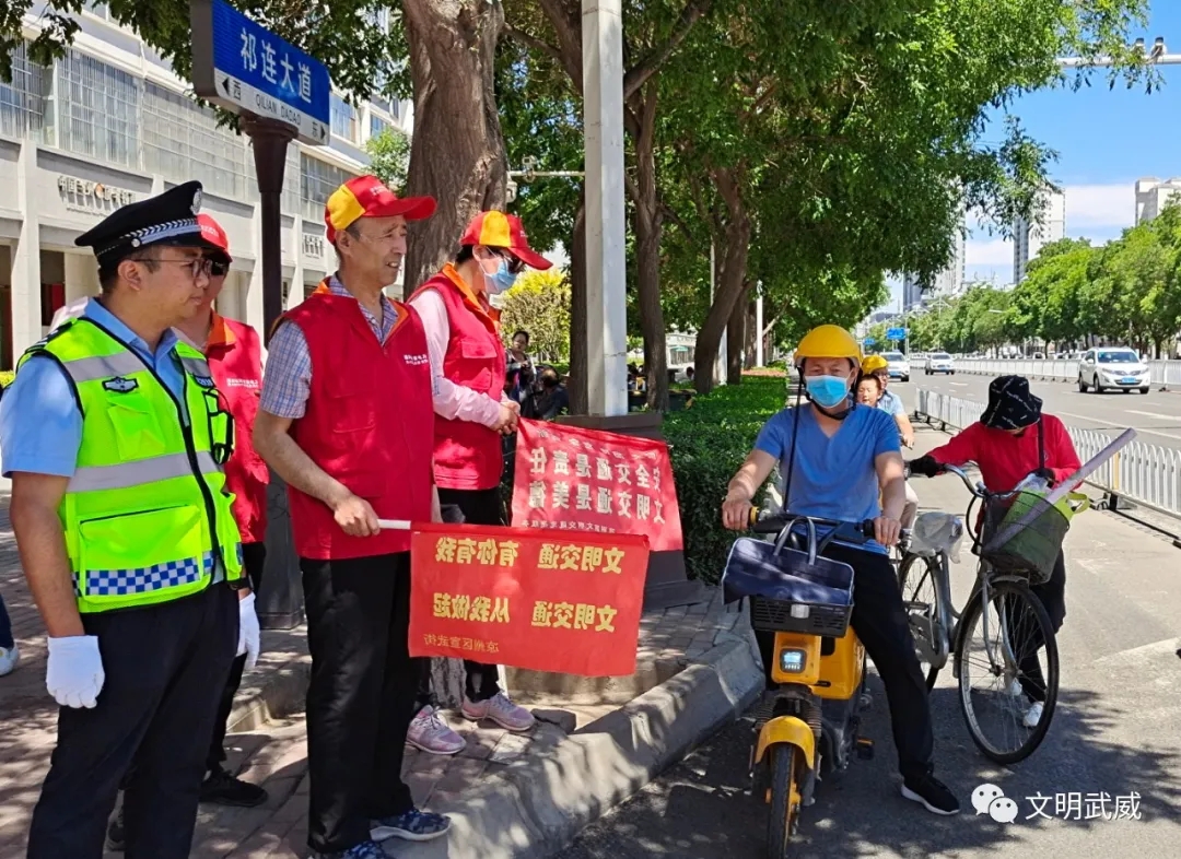志愿者引导行人按红绿灯信号过马路,不闯红灯、不翻越护栏、 不走机动车道,劝导摩托车和电动车驾乘人员规范佩戴头盔,劝阻非机动车闯红灯、逆向行驶、不按规定车道行驶等不文明行为,强化市民文明交通意识,维护文明安全的交通环境,助推全国文明城市创建。
