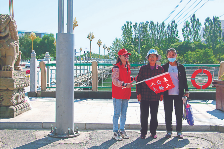 每天早午交通高峰期,城区主次干道交通路口,都能看到“红马甲”的身影。“请您戴好安全头盔。”“小朋友,过斑马线不能打闹哦……”